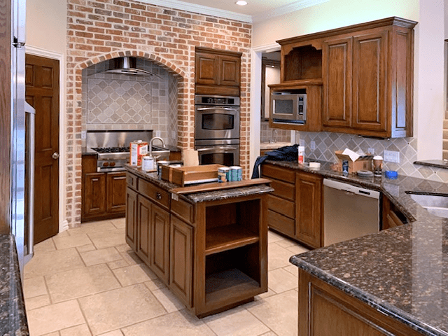 During - Stain to paint kitchen cabinets + faux (Faux Cabinet Painting Keller, Texas 76248)